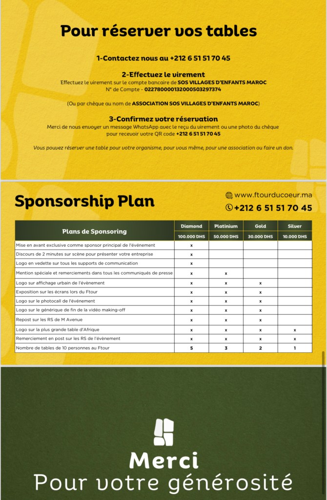 Cette année, nous sommes déterminés à renouveler l’expérience du « Ftour du Cœur et des Sens », en y ajoutant une dimension encore plus solidaire. En partenariat avec SOS Village, organisation reconnue au niveau mondiale et certifiée pour la collecte de la zakat, nous ouvrons nos portes uniquement à des sponsors sérieux et engagés.